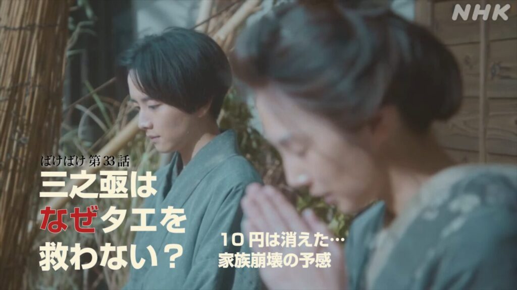 - タエの物乞いが松野家にバレる:エンディング直前の衝撃展開。雨清水家の困窮ぶりが明らかになることで、明日への大きな伏線となる